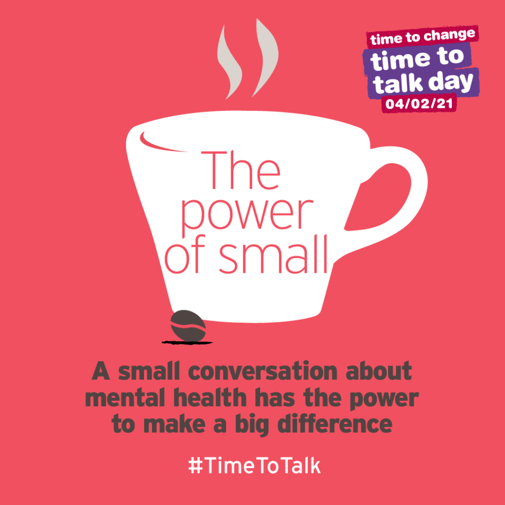 This year’s focus for Time to Talk day is on the power of small, because however you have a conversation about mental health – whether it’s a quick text to a friend, a virtual coffee morning with colleagues, or a socially distanced walk and talk with your family – it has the power to make a big difference.